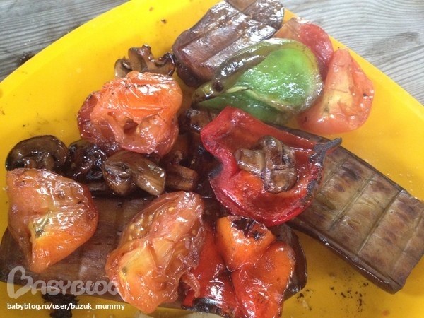 Берем баклажаны, помидоры, сладкий перец и шампиньоны. Режем все пополам, перцы можно на три части, как получится. Помидоры если очень большие режу на четверти, а грибы можно не резать, кто как любит. Главное это маринад. Берем по одной части соевый соус, бальзамический уксус и оливковое (подсолнечное) масло. Все овощи кладем пакет (без дырок!), лучше в два)) Заливаем смесью соусов, завзываем и кладем на солнце! или около мангала в тепло... ждем часа 2-3 пока все пропитается и промаринуется, жарим на решетке. Отличный гарнир к шашлыку летом. Жаль что рецепт вспомнила, когда лето закончилось))