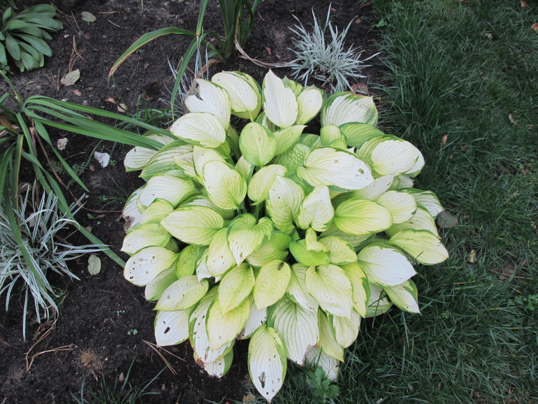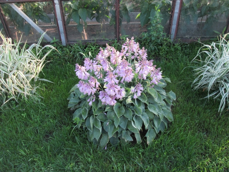 Кстати обычную декоративную осоку, которая очень сильно разрастается посадила в старые прямоугольные пластиковые ящики для балконных цветов про совету соседки. Получились аккуратные пушистые кустики правильной формы. Осока не расползается и смотрится супер. На следующем фото около парника на заднем плане. Между ними хоста.