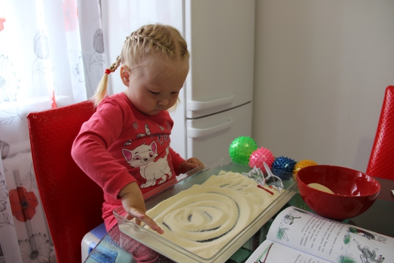 Пошли мы на кухню где ждал нас необычный лоток с волшебной песком манкой) Познакомились, поковырялись, вспомнили как мы рисовали горы, речку и тд, дошло дело до сказки. Я думала что буду читать - рассказывать сказку и вместе будем играть. Но нет, ребенок сказала -Кыш, не мешай. Книжка так пролежала рядом)