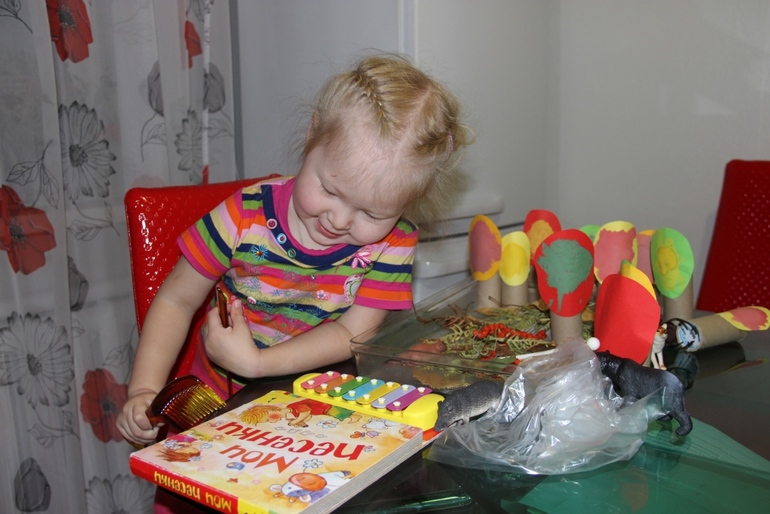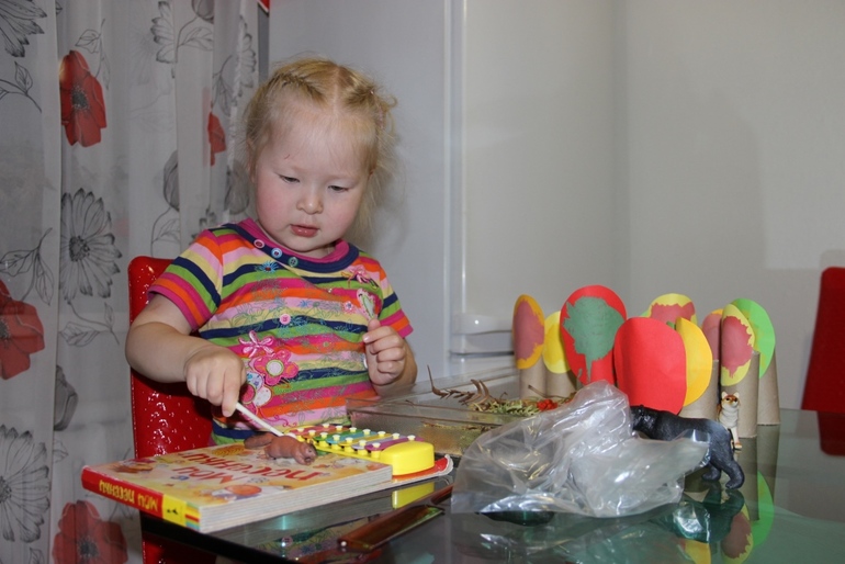 Как Марианне понравилась эта идея. Ксилофон, расчески, мешочки, сухими листочками шуршали и пальчиками по столу) Главная героиня-белка на первом плане)