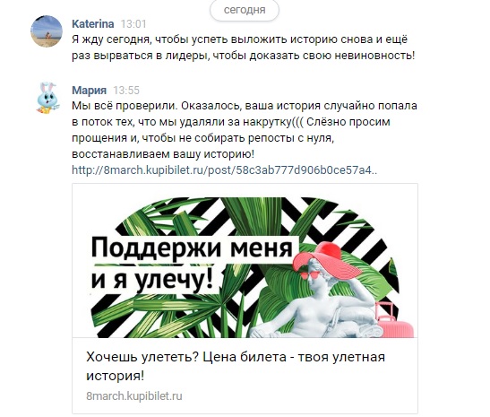 И снова здравствуйте! Справедливость восторжествовала, я потребовала доказательств, а мне в ответ прислали извинения, мою историю восстановили! Только теперь до лидера мне нужно ещё примерно 150 репостов! Конкурс продлится до пятницы, ваша поддержка мне очень нужна!!!! Только пожалуйста, не используйте фейковые страницы, я всегда играю по честному! Огромное спасибо всем и каждому за поддержку!!!!!!!