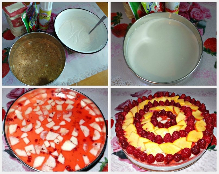 Уложить нарезанные кусочки фруктов в центр остывшего чизкейка.Тонким слоем желе покрыть фруктами Отправить простой чизкейк из творога в холодильник на пару часов, до застывания желе.