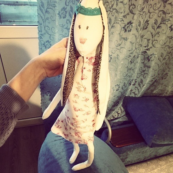 а это мадам Тильда))) Я увидела игрушки Тильды и влюбилась в них )) Взяла за основу ее технику шитья и просто нарисовала своего зайца,т.к выкроек у меня нет и родилась у нас вот такая миледи)) Она тоже сидит в кроватке с Верой,как раз ее рождение пришлось на момент моего решительного перевоспитания дочи засыпать самой. Я мечтаю нашить много таких зайчиков ей в комнатку,это еще и красивая часть интерьера) хочу теперь сову сшить и развивашки с пуговичками)))