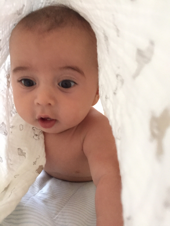 Милый малыш, научился играть с мамой в прятки, и весело хохочет, когда я появляюсь из-за игрушки!:)))