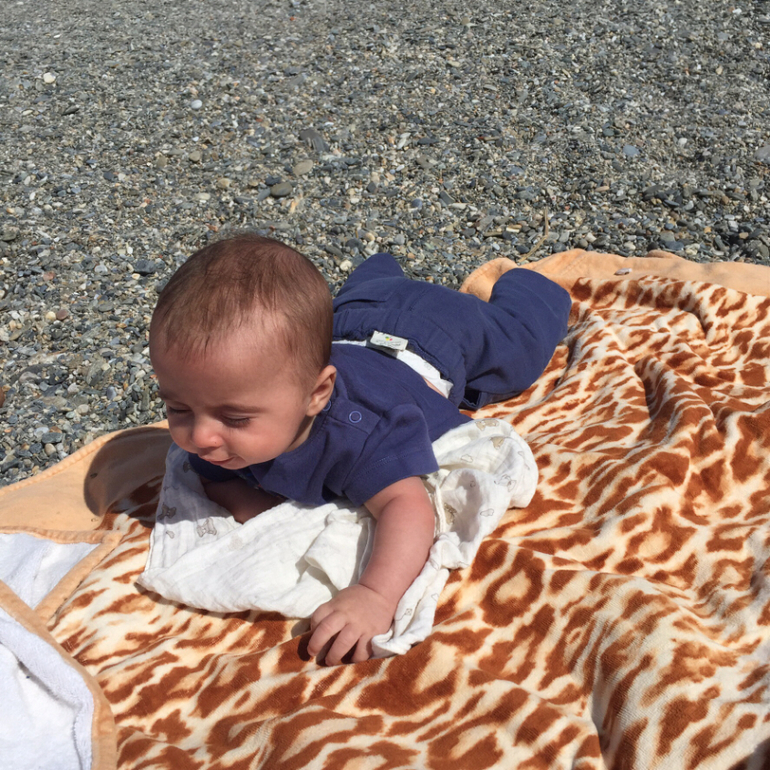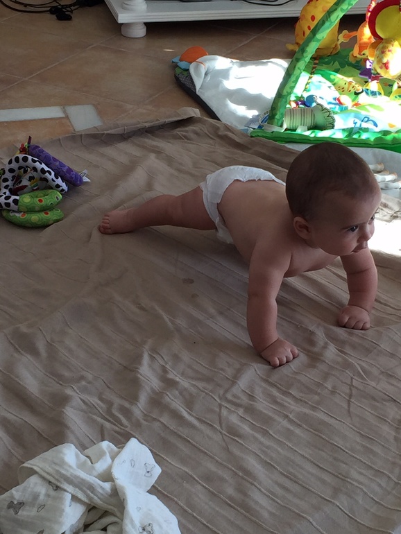 Очень, просто очень любим лежать на животе. А как научились переворачиваеться недели три назад так вообще. Рома определенно пытается ползти, не всегда получается, чаще застревает на животике- но позу собаки совершенствует с каждым днем. Любим стоять, и все рассматривать с другого ракурса. Мечтаю, что первые шаги сделает по песку вдоль моря.