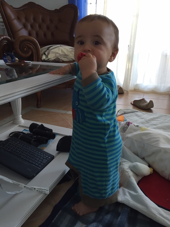 Зато хорошо встаем на ножки, это с 6, с опорой встает сам на ножки и стоит , держится- пытается смахнуть все со стола. Любит толкать стулья и кусать меня за нос.