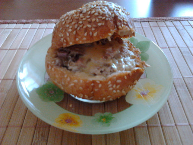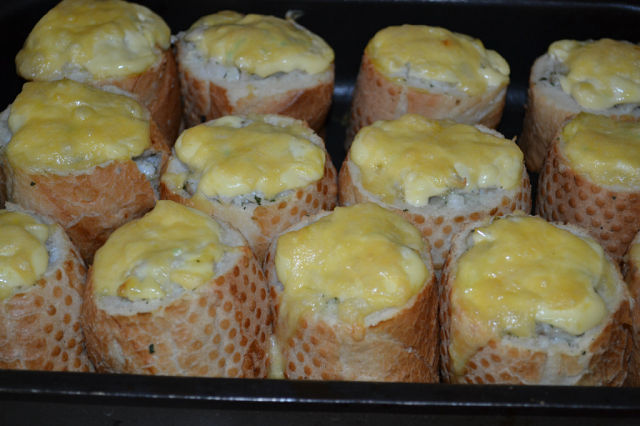 Обжарить шампиньоны с луком на сливочном масле.Отварить окорочка,отделить от косточек и порезать кубиками.Добавить резанную кубиками ветчину и заправить сметаной,потушить 5-10 минут. Срезаем не до конца крышечку и вынимаем мякушку. Начинить булочки начинкой,посыпать тёртым сыром и в микроволновку на 1 минуту! ВСЁ! Приятного аппетита!