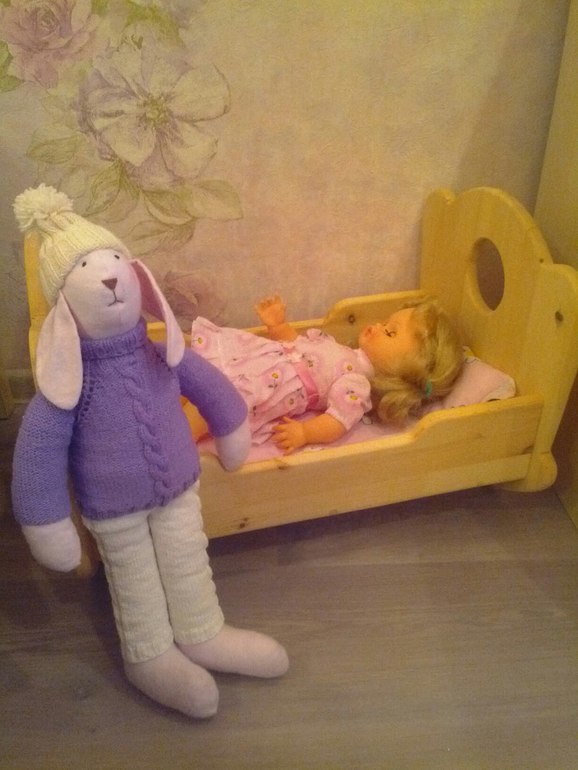 Люлька для куклы. Долго искала именно деревянную качалку. Большая - 50 см. Софья покачалась сама, теперь там спит кукла, тоже подарок. Заяц - мое творение. Хотелась, чтоб у дочки была игрушка сшитая мамой.