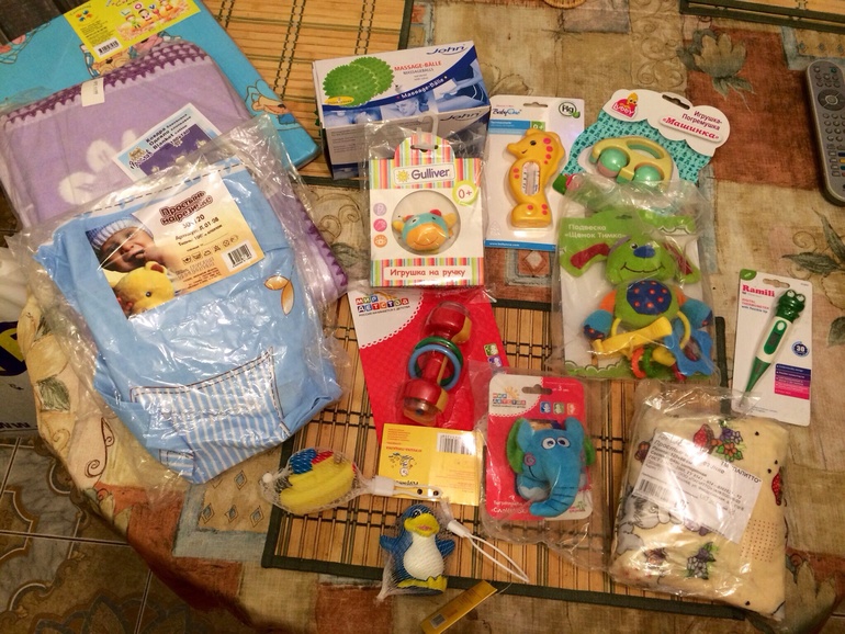 2-е простынки на резинке, один комплект постельное белья (пара уже есть), погремухи, одеяльце (теперь их три разных), термометр для воды, термометр с гибким наконечником в виде лягушонка и другая мелочь!!!