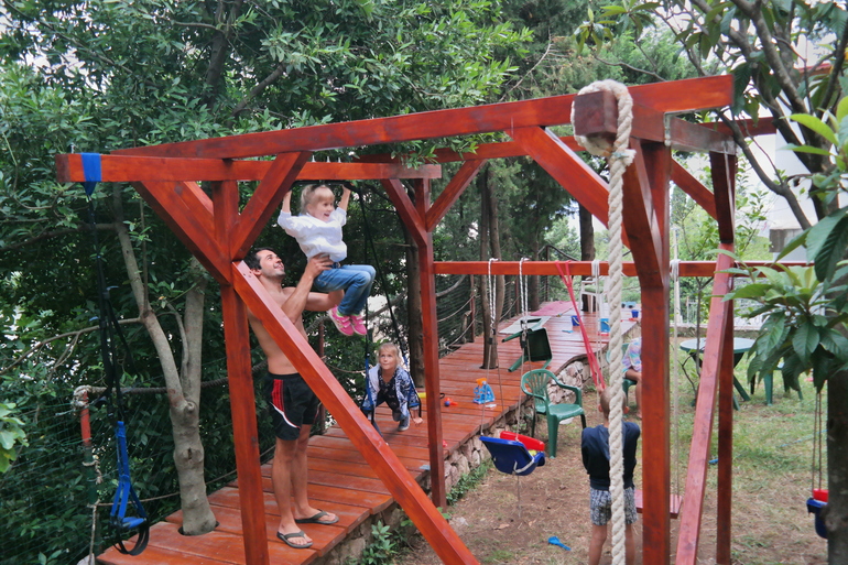 Перед домом большой зелёный двор с зоной барбекю и детской площадкой с качелями.