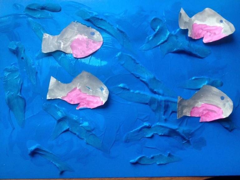 Скатали колбаски из пластилина, размазали их по бумаге, потом выжавили на бумагу синию краску и размазывали поверх пластилина. Сверху на краску приклеили, заранее заготовленных пираний.