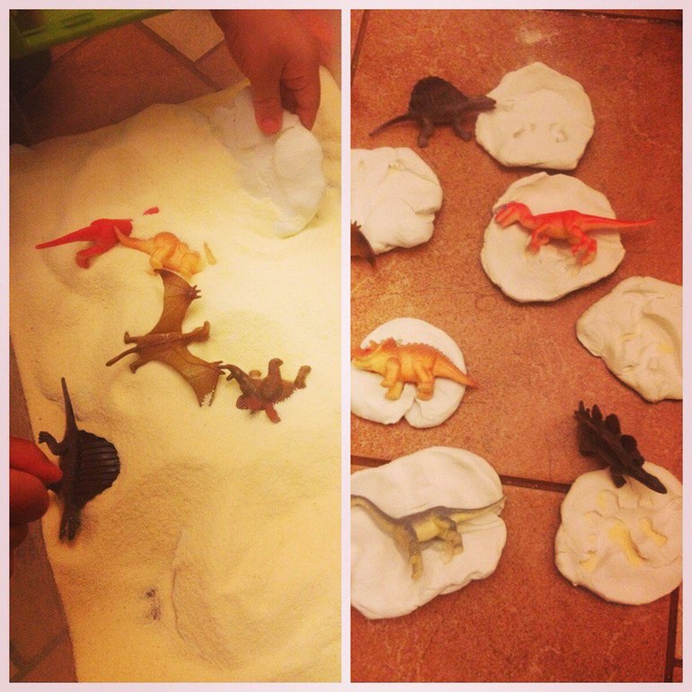 После ванны приступили к раскопкам. Искали в манке отпечатки динозавров и подбирали к ним фигурки. Яру очень понравилось, еще долго сам закапывал, а потом искал))