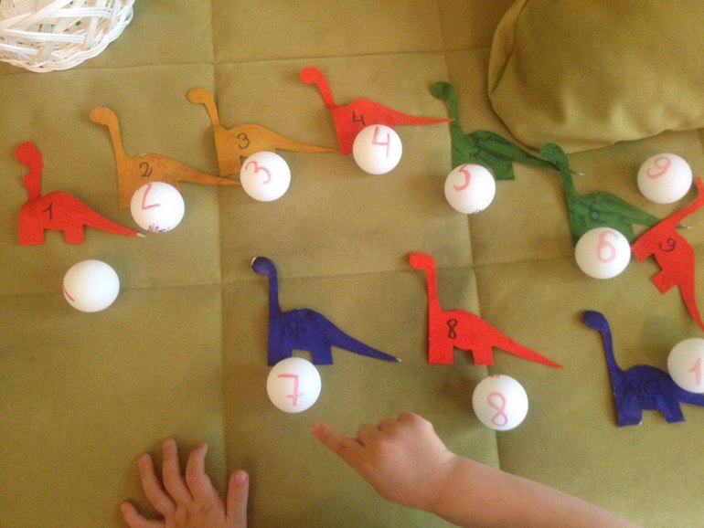 Рассказала Яру, что динозавры вылупляются из яиц. Принесла 10 картонных динозавриков с цифрами и сказала, что они потеряли свои яйца. Бегали по квартире, искали яйца. Потом подбирали каждому динозавру яйцо с его номером, считали.