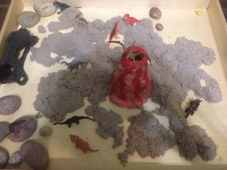 Пока спал, подготовила ему в песочнице мир динозавров. Пока сидел там колупался, я собралась, погладила нам вещи и пошли гулять. Погода разгулялась.