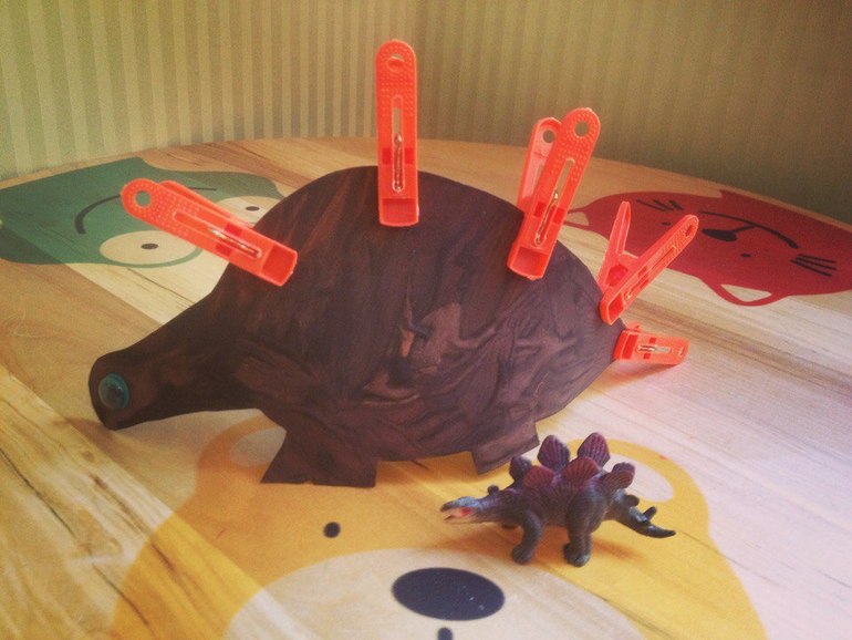 Потом делали стегозавра. Основу в форме туловища я подготовила заранее. Мы ее покрасили, приклеили глазки и сделали гребень из прищепок. Ярику так он понравился, что он даже потом на дневной сон с ним спать лег. Он сказал, что это папа, малыш у нас был в наборе динозавров, так, что оказалось, что нужна еще мама.