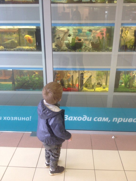 Погуляли на площадке, поиграли "попринимали гостей" в домике, пошли в зоомагазин. Надо было купить Сниффу таблетки и заодно наблюдали за рыбками. Рассматривали, что есть в аквариумах. В планах сегодня аппликация "Аквариум".