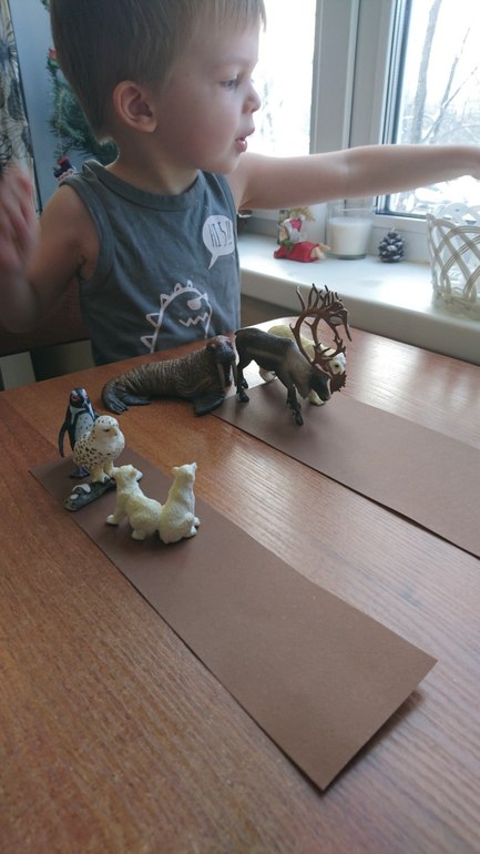 Положила перед ним две "дорожки". Учили понятия широкий-узкий, шире-уже.