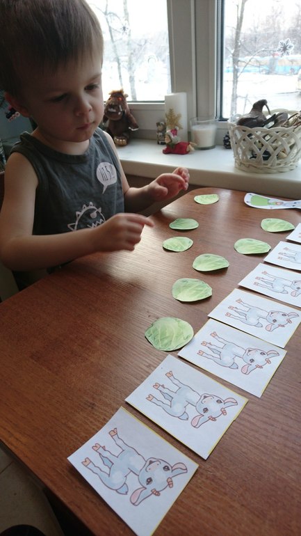 Посчитали козлят, раздали им по капусте. Одна капуста осталась, значит козлят больше. Козлят много, а волк один. Капуста круглая.Пару раз проиграли сказку "Волк и семеро козлят".