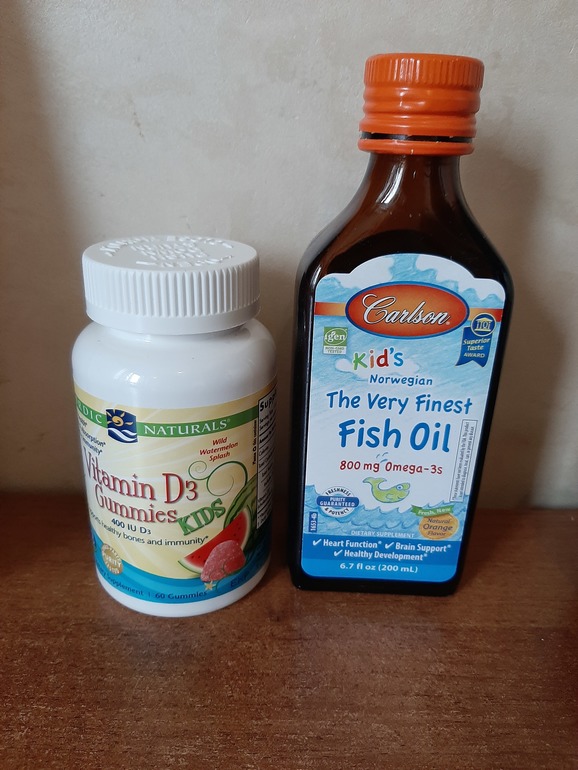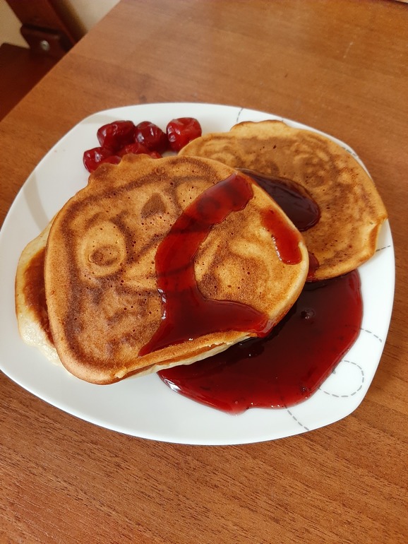 Пока Яр смотрел мультики я готовила завтрак. На завтрак оладушки с джемом, и каждому свой комплект витаминов))
