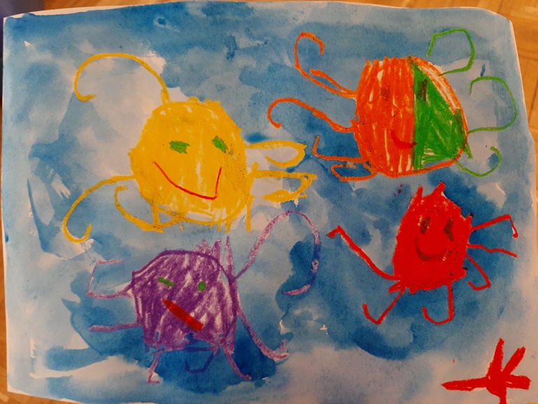 В студии им сегодня читали Успенского, потом две книги его взяли домой. А в творческой мастерской они рисовали пастелью осьминожек.