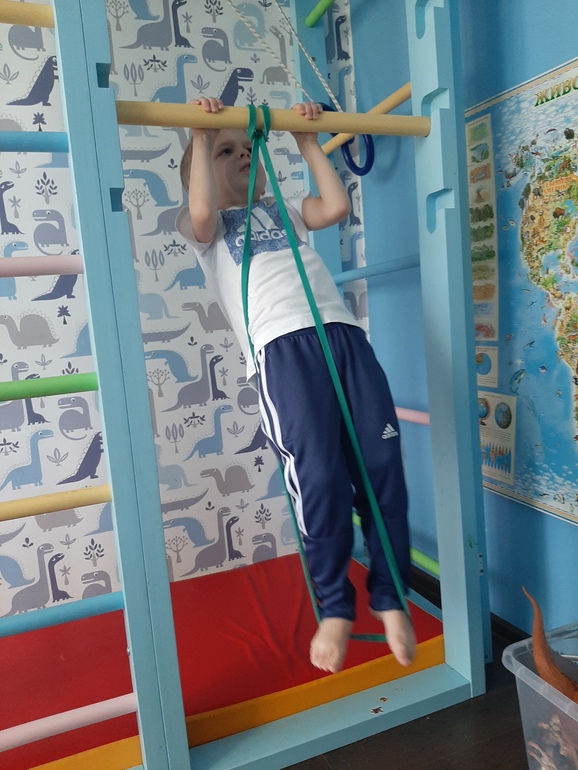 19. Лёгкие подтягивания (ноги ребенка между ног взрослого, который держит его за руки и ребенок подтягивается.)