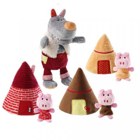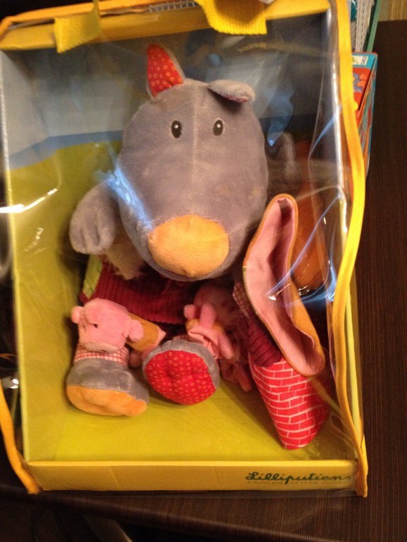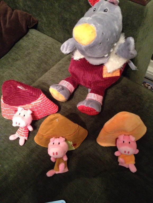 Во-первых кукольный театр Волк и три поросенка, он у нас тряпичный от Lilliputiens. Очень качественный и даже домики есть, волк одевается на руку, а поросята на пальцы.