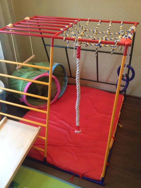 А пока занимаемся дома. У нас с восьми месяцев спорткомплекс Ранний старт, очень любим висеть на кольцах и трапеции, когда весит на трапеции, я поднимаю его ноги к ней и покачиваю, чтобы понял, что можно туда ноги закидывать. Горку тоже очень любим, ползаем по ней вверх-вниз, перелезаем через неё и тд. Лестница пока не в фаворе, пару раз залез, но ступням видать больно, не понимает ещё, что надо на переднию часть ступни опираться. Но всё впереди. На Новый Год еще планирую докупить дополнения к нашему комплексу лестницу Скрипалева, роликовую дорожку и балансир бревно.