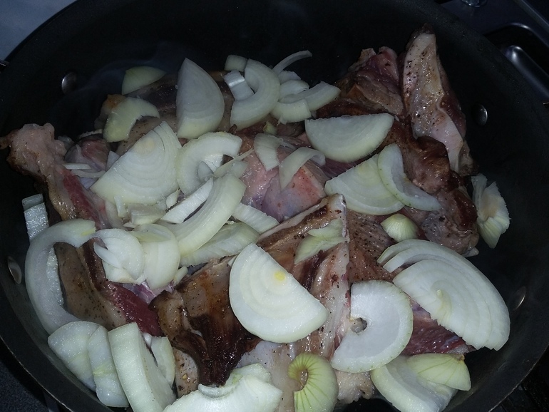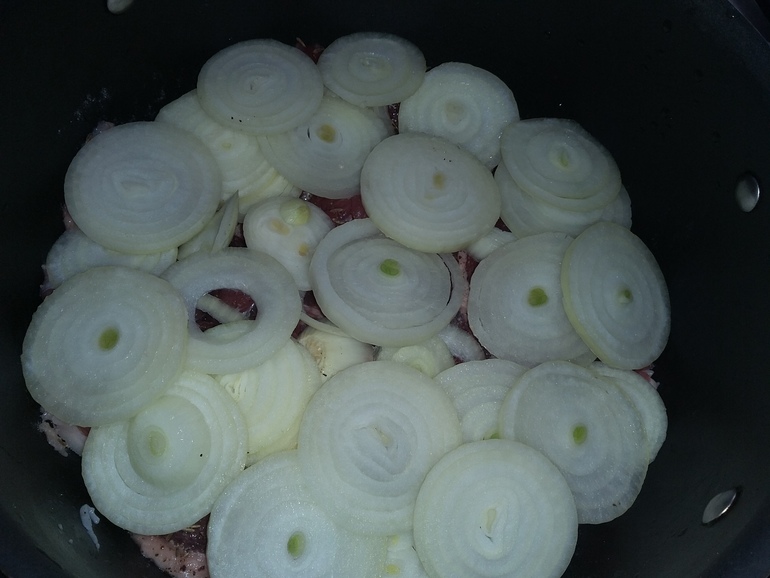 Посолить и поперчить, переложить в казан, щедро пересыпая луком: