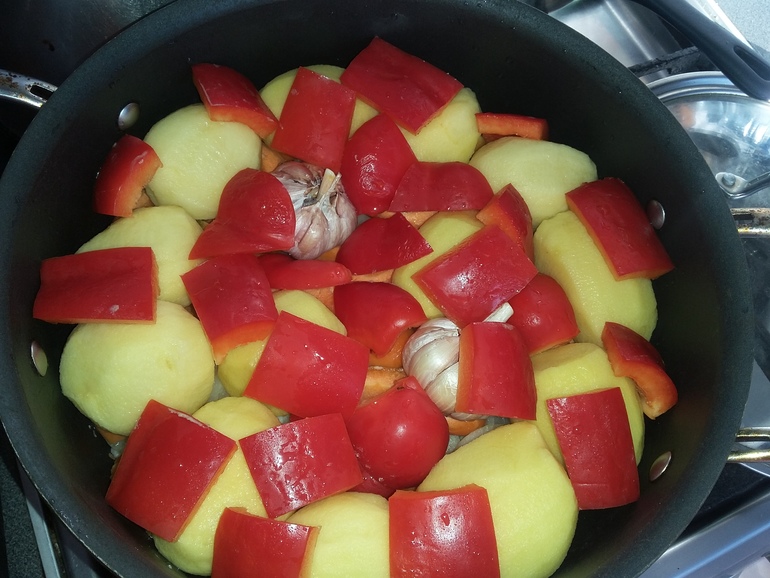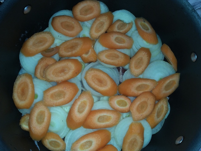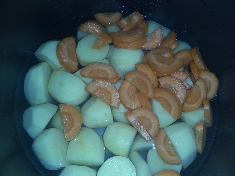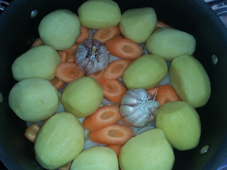 Уложить крупные куски картошки и моркови, влить стакан воды, тушить почти до готовности: