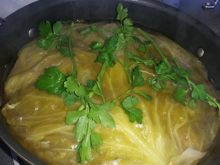 После закипания уменьшить огонь и тушить 1 час. Затем положить петрушку и кинзу целыми веточками (потом удалим):