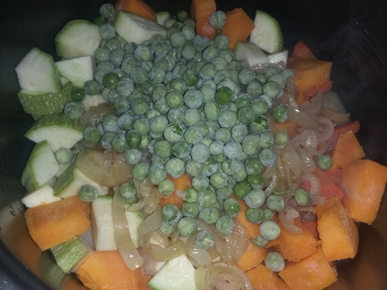 Переложить овощи к картошке. Добавить мороженый горошек: