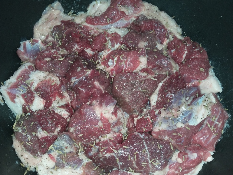 Кусочки баранины (2 кг) расположить жирком к стенкам. Посолить, поперчить, добавить зиру: