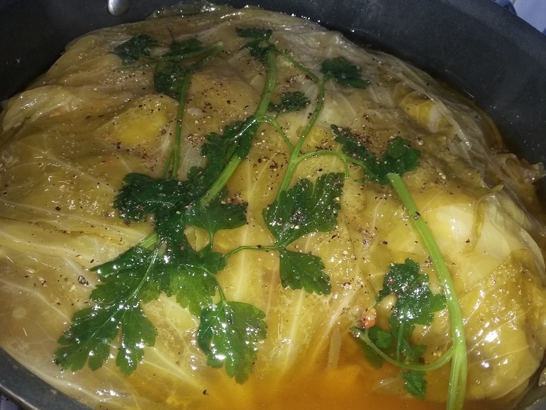 1) Выложить на большое блюдо капустные листья, затем все содержимое казана (без жидкости).