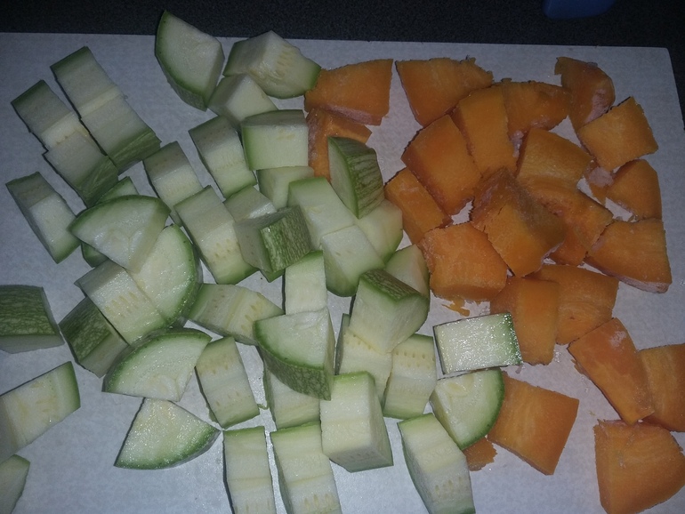 Нарезать кубиками кабачок и тыкву: