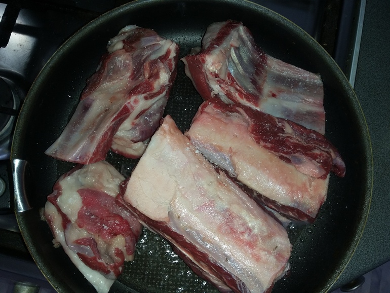 Нарезать на куски. Обжарить на растительном масле для получения румяной корочки сначала баранину и говядину: