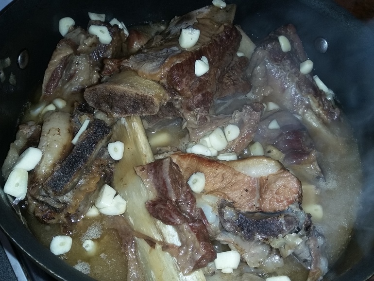 Тушить вместе еще 40-50 минут. Добавить головку мелко нарезанного чеснока и лавровый лист: