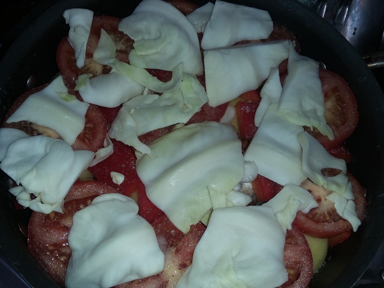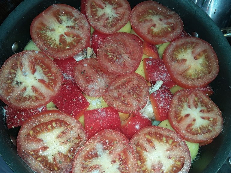 4 помидора кольцами, соль, черный перец: