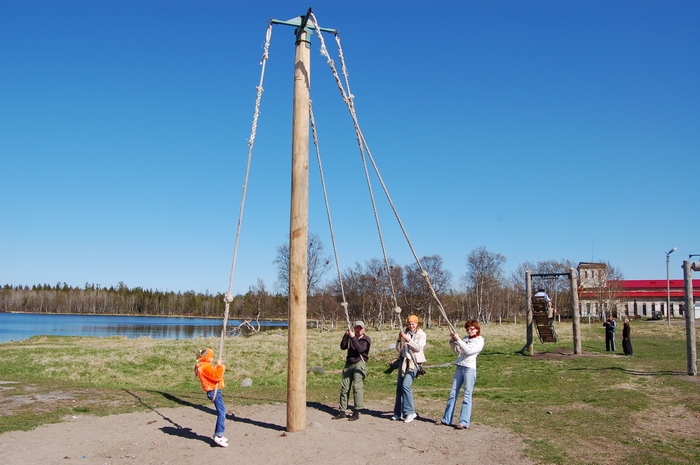 Прям на берегу небольшой детский городок. Деревянные качели-карусели. Вспомнили детство. Было очень весело!