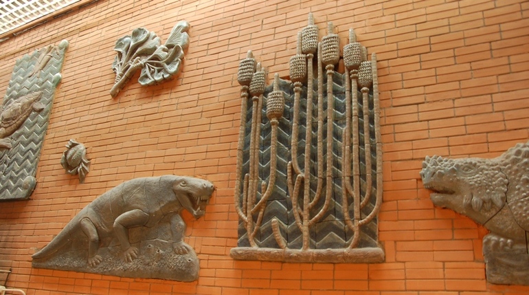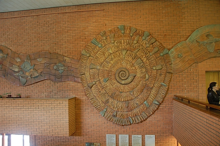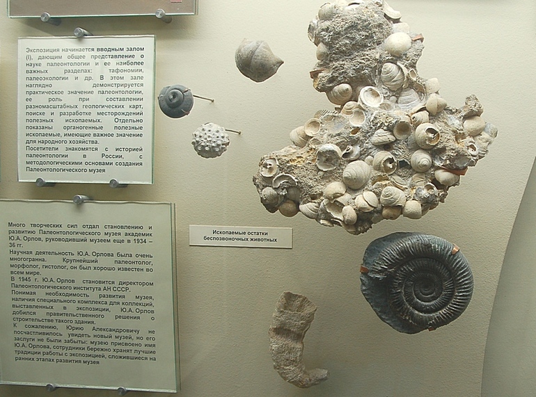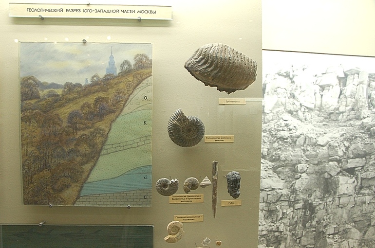 В застекленных стендах представлены сотни окаменелостей, живших когда-то на нашей планете. Есть даже срез Юго-Запада Москвы. Все подписаны.