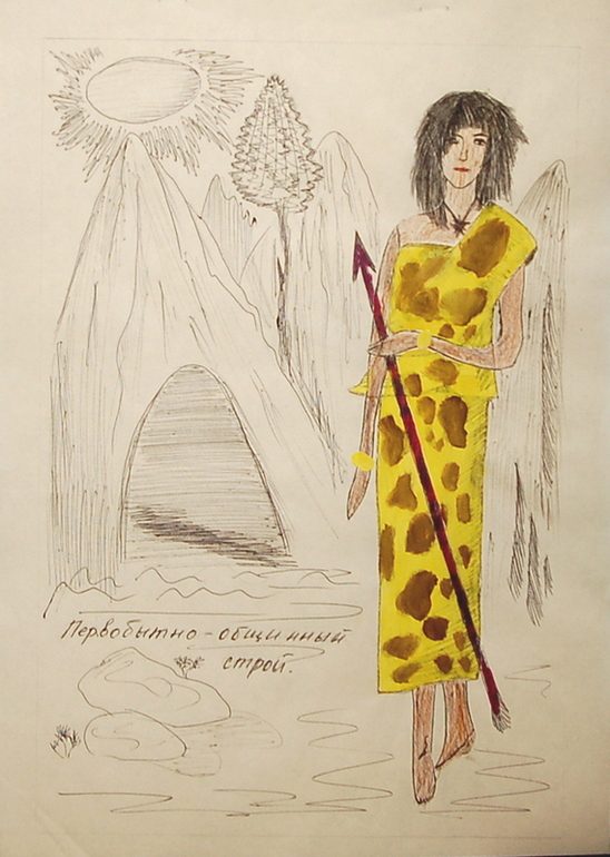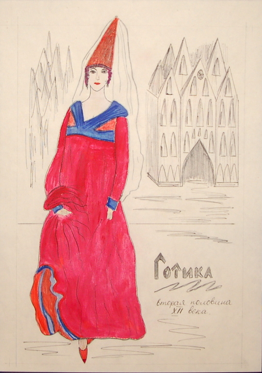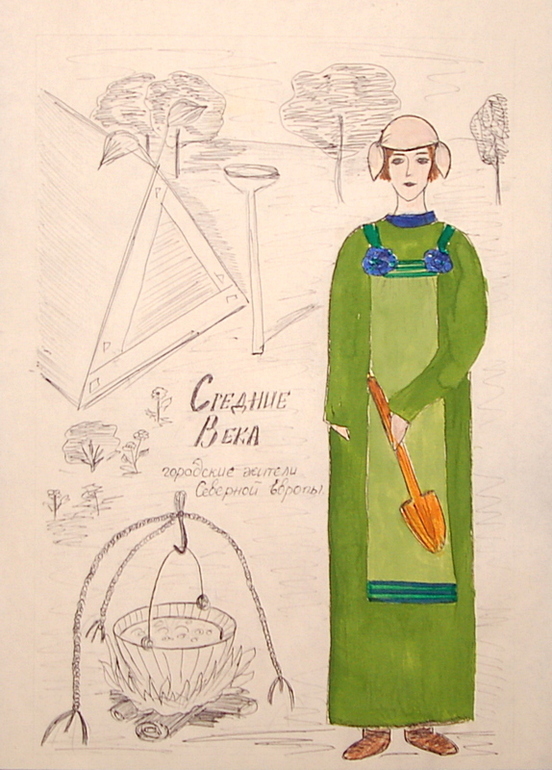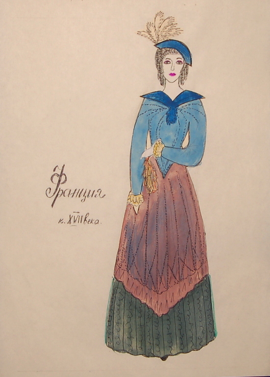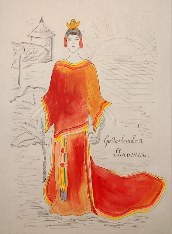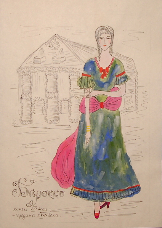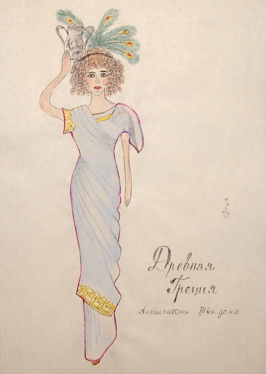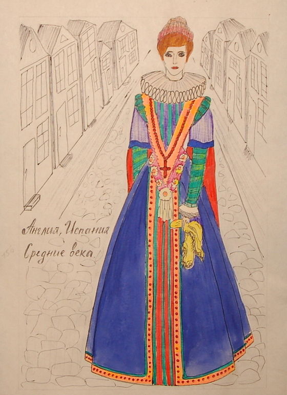 Не помню уже точно, на чем я основывала своё видение костюмов. Что-то из головы, что-то подсматривала из энциклопедий, но точно не копировала какую-то конкретную одежду. Кстати, рисовать фон было так же интересно, как костюмы. Само собой, что на историческую точность я совершенно не претендовала, просто был творческий порыв ))