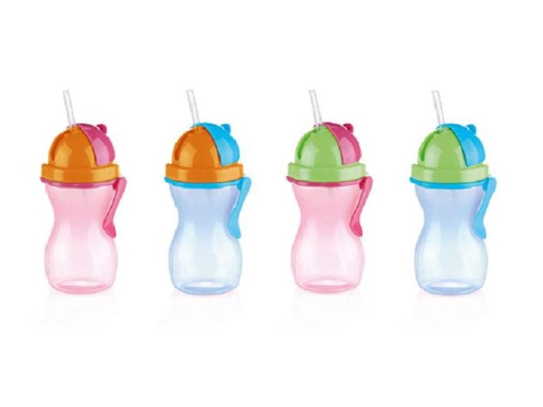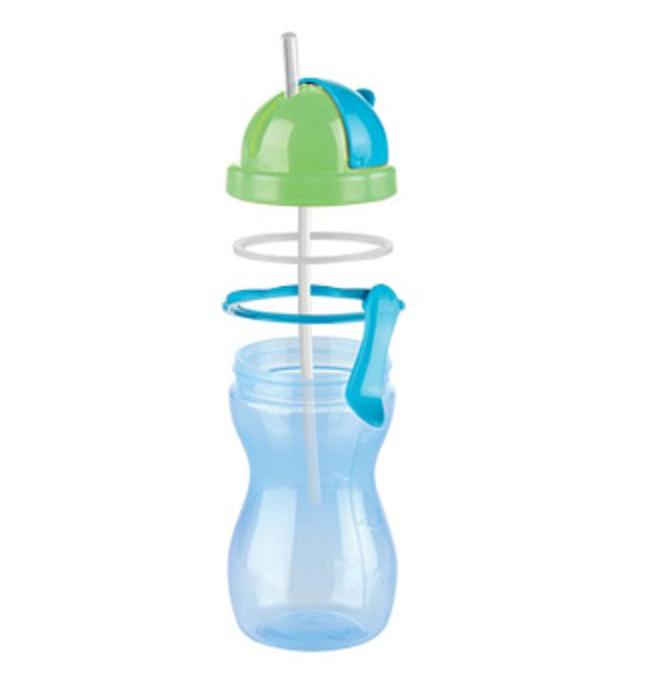 Детская бутылочка с гибкой силиконовой трубочкой и уплотнением, шкалой для удобного отмеривания и зажимом для подвешивания.
