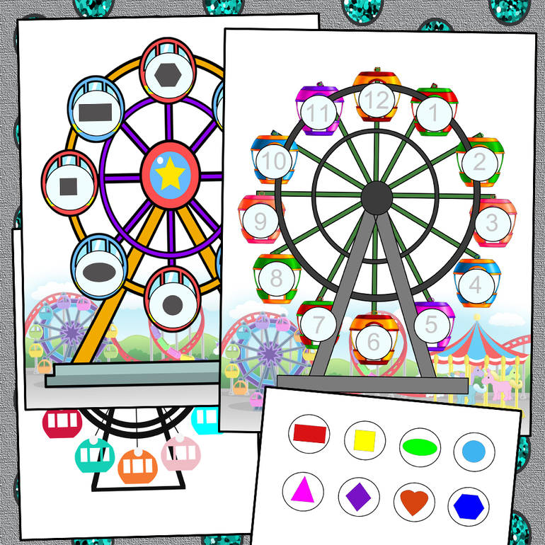 Это набор лото : цифры,геометрические фигуры,цвета. К каждому колесу обозрения подходят определенные карточки) Ребенок просто накладывает вырезанные карточки на свои места)