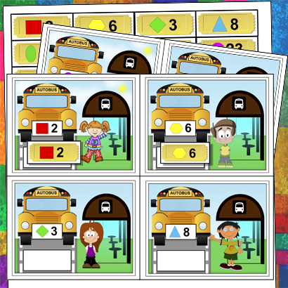 Как играть: ребенок должен найти соотетствующий билетик для каждого автобуса ( цифра и геометрическая фигура)