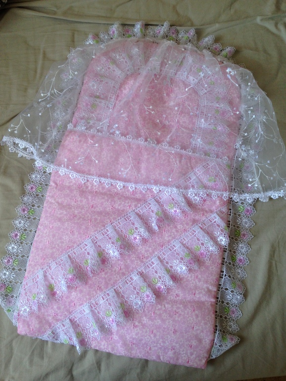 В итоге новый мимимишный конверт. Розовый. с накидкой из гипюра (ну или как назват это вот чем личико накрывается. Смотрю на него и еще б родила, чтоб в нем выписаться ) .