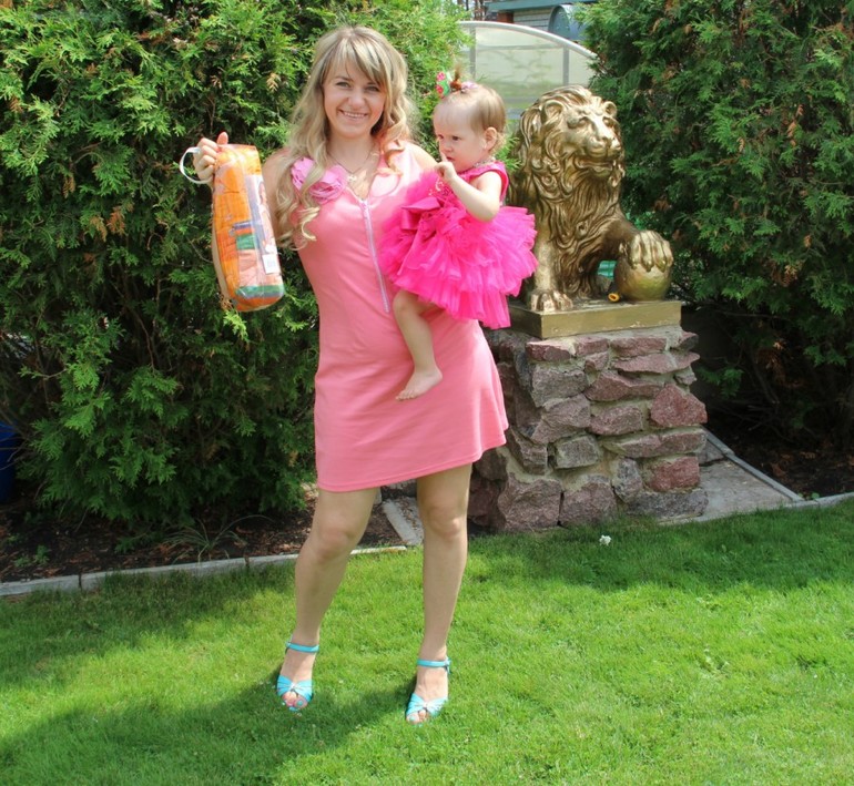 Слинг подошел под моё розовое платье, купленное в обычном магазине и переработанное в кормительное при помощи рук любимой слинго кудесницы Кати Хомич за счет вшивания молний со стразами.