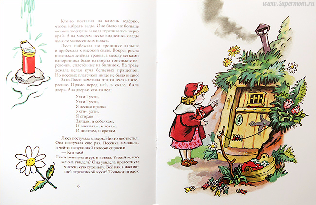 Классический певучий текст, добрые и выразительные иллюстрации, и, что важно, не слишком отталкивающий образ злой ведьмы. Подойдет детям 2+.