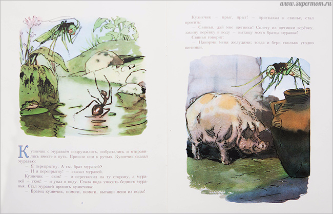 Однажды кузнечик и муравей отправились в путь, и по дороге им встретился ручей. Кузнечик перепрыгнул, а муравей упал и начал тонуть. Чтобы спасти друга, кузнечику пришлось просить щетинку у свиньи, чтобы сплести веревку, но свинья за щетинку попросила желудей. Кузнечик пошел к дубу, а тот попросил прогнать ворона, ворон попросил куриное яйцо, курица попросила проса из амбара, амбар попросил прогнать мышей, мыши попросили избавиться от кошки, кошка попросила коровьего молока, корова попросила травы. Вот эту траву он и принес корове, чтобы в конечном итоге получить щетинку, сплести веревку и вытащить своего друга муравья.