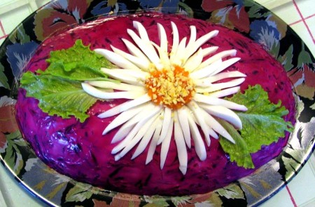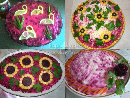 Начнем с домашнего варианта. Нам могут понадобиться: круглые ломтики свеклы брусочки моркови ломтики лимона огуречная кожура кукуруза горошек желток и белок яйца грецкие орехи зернышки граната маслины оливки зелень Из лимона делаем лебедей, из свеклы - настоящие розы. Ориентируемся и выкладываем цветы и всевозможные рисунки..