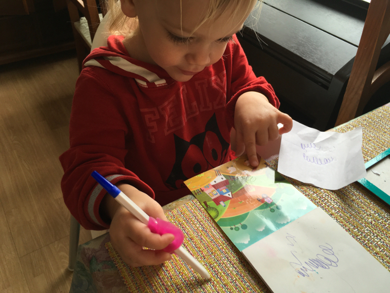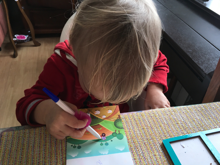 Карандашом или ручкой с тренажёром обязательно, пастелью , красками. Аппликация и лепка идут у нас в другие дни. Этот нехитрый тренажёр формирует правильный захват. После нескольких попыток, ребёнок держит пишущие принадлежности правильно.