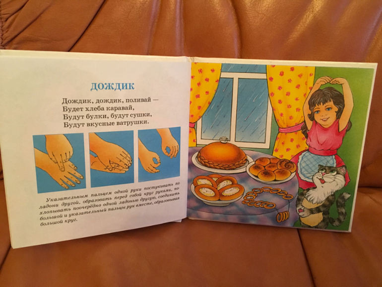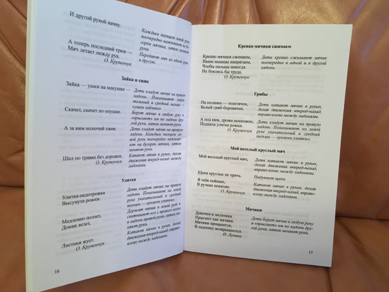 Традиционно занятие мы начинаем с массажа ручек, начиная от пальчиков и до локтя. Я уже показывала нашу массажную корзиночку, но благодаря появлению у нас вот этой чудесной книжки, массаж наш видоизменился и стал более разнообразным.